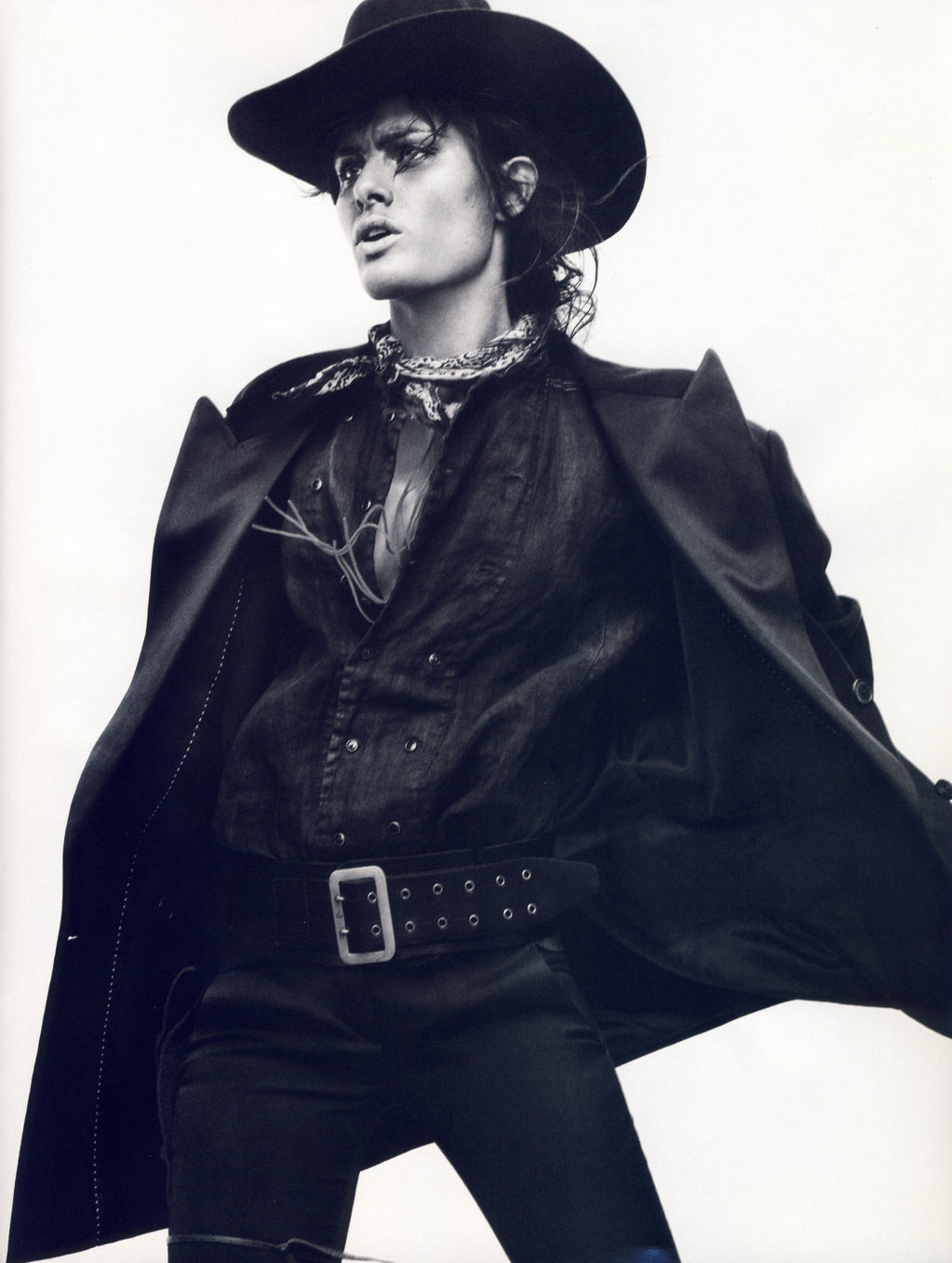 This editorial is shot by David Sims for the latest issue of Vogue Paris. Emmanuelle Alt has transformed Isabeli Fontana into a cowgirl and she looks absolutely beautiful and cool! The photos are very stunning as I feel like each image is like a oil painting and you can totally hang them on the wall as some expensive art pieces. If you are a cowboy/cowgirl fan, I am sure you will love this set.